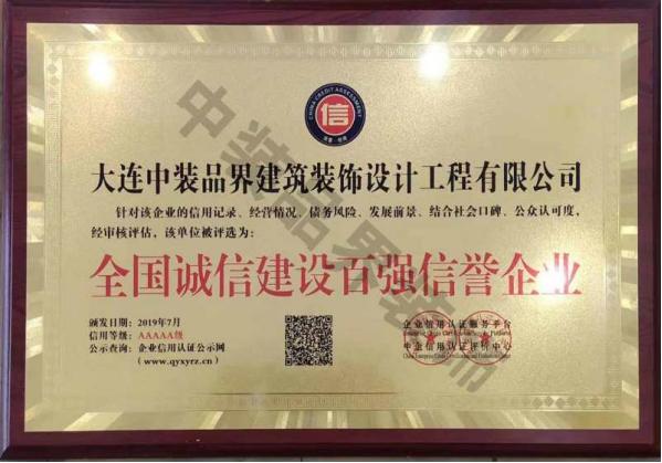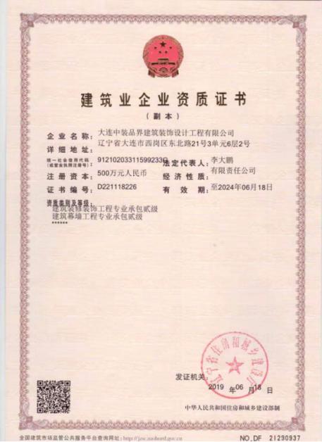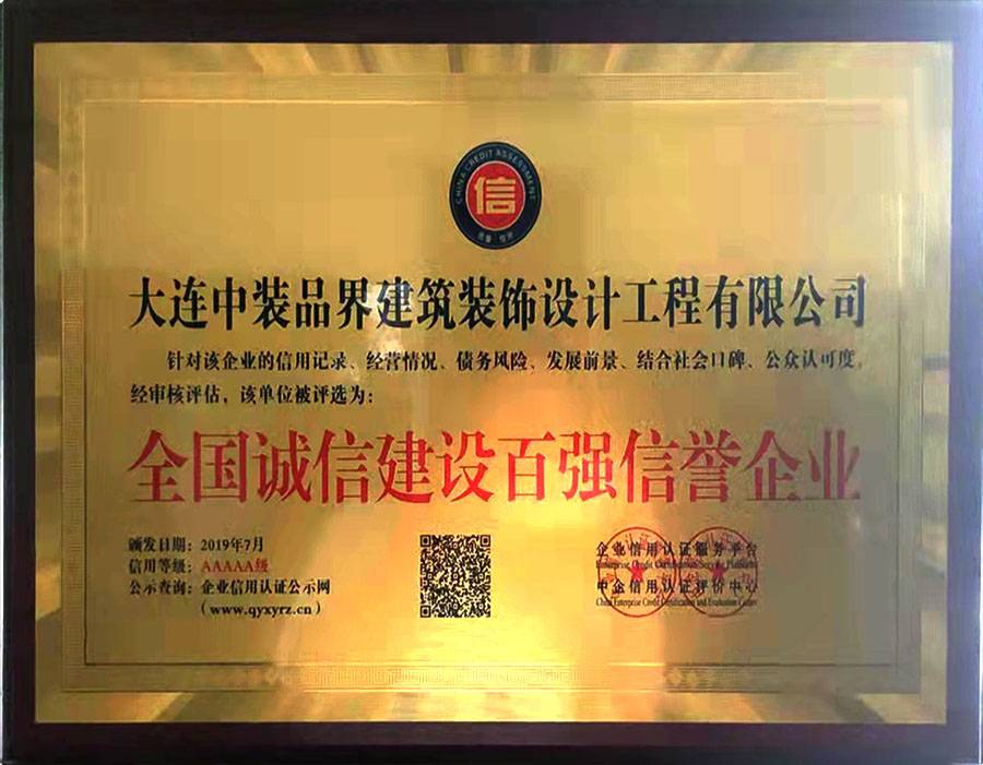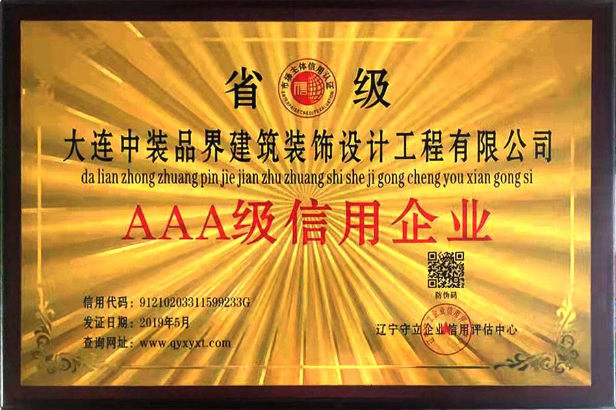 大連中裝品界建筑裝飾設計工程有限公司是集設計和施工為一體的建筑裝飾企業。公司成立于2015年,具有建筑裝修裝飾工程專業承包貳級、建筑幕墻工程專業承包貳級、建筑裝飾工程設計專項乙級、建筑幕墻工程設計專項乙級等行業資質證書;2019年被評為遼寧省AAA級信用企業;同年被評為全國誠信建設百強信譽AAAAA級企業。